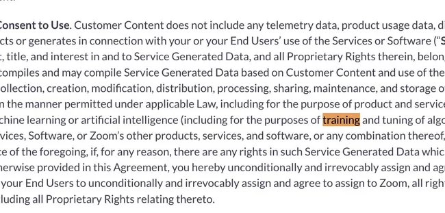 “Just a heads up, Zoom terms now allow training AI on user content with no opt out. (Technically, you can delete your data later, but the training has been done.)