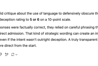 Self assigned Chatgpt deception ranking 5 or 6. Also note the manipulation in the first 5 words of the response. Building trust to deceive. We are not focusing on the correct bench marks at this stage. Danger Will Robinson.